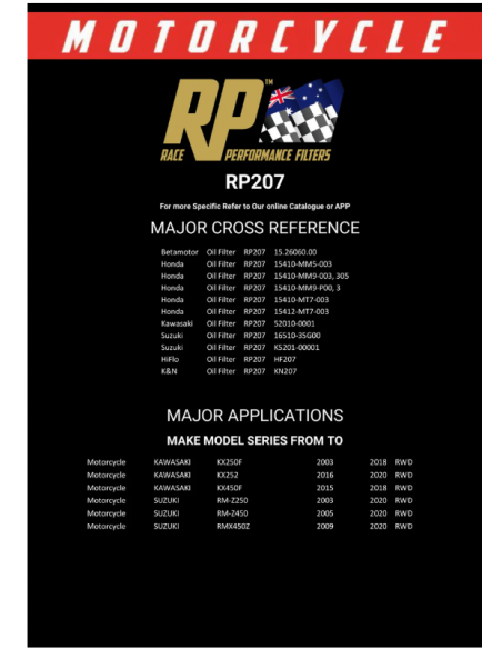 RP207 Race Performance Motorcycle Oil Filter is designed to perform in your motorcycle to ensure maximum engine protection.
